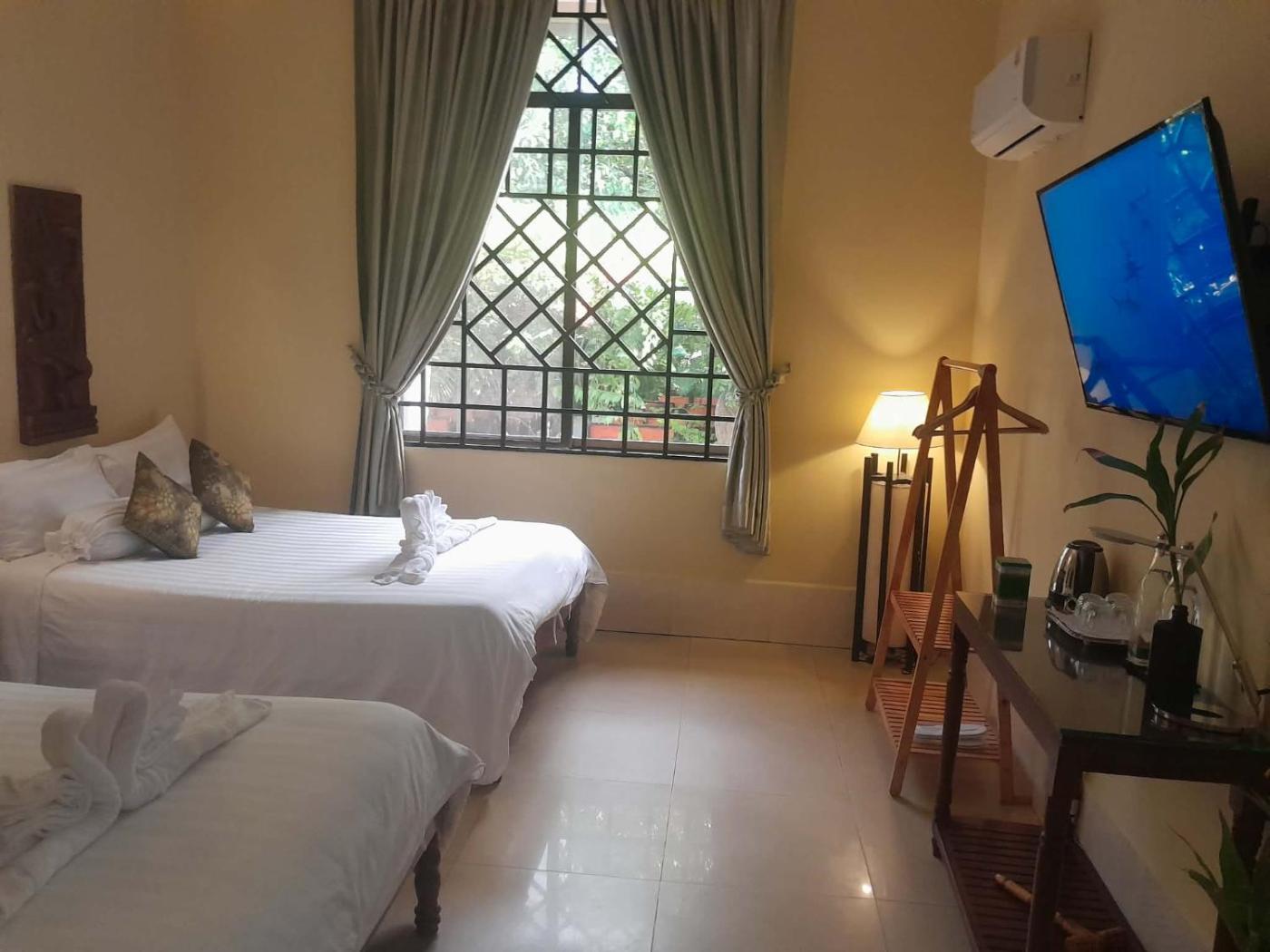 Large Twin Room. This large air-conditioned twin room opens up to views of the garden. It features 2 double beds and a 48-inch internet TV. The en suite bathroom includes shower facilities and free toiletries. ;