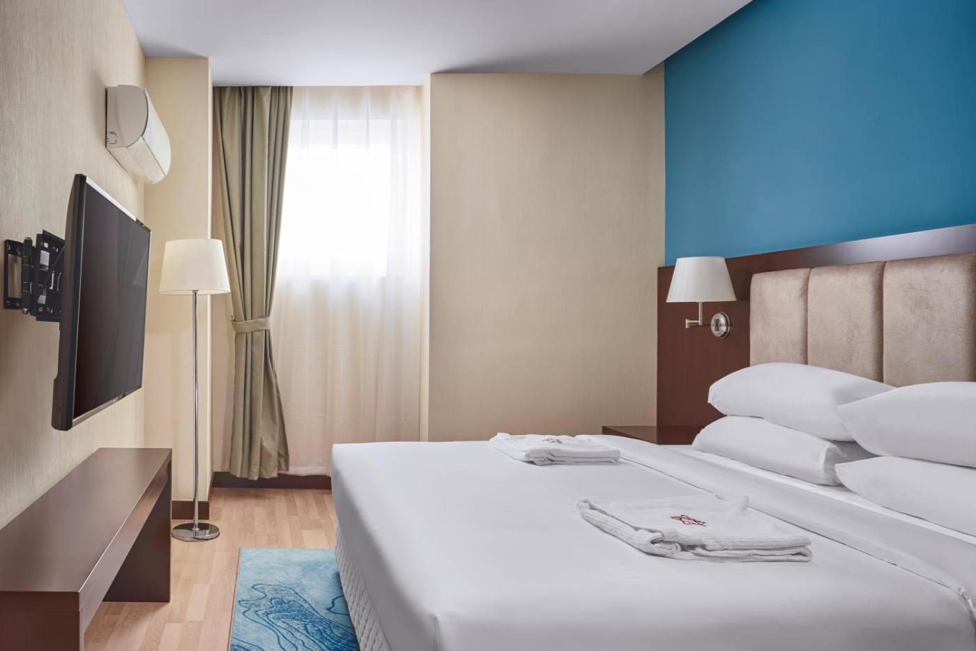 Executive Suite. This spacious suite features 1 living room, 1 separate bedroom and 1 bathroom with a bath and free toiletries. The suites kitchen is available for cooking and storing food. The air-conditioned suite features a flat-screen TV, a minibar, a tea and coffee maker, executive lounge access as well as city views. The unit has 3 beds.