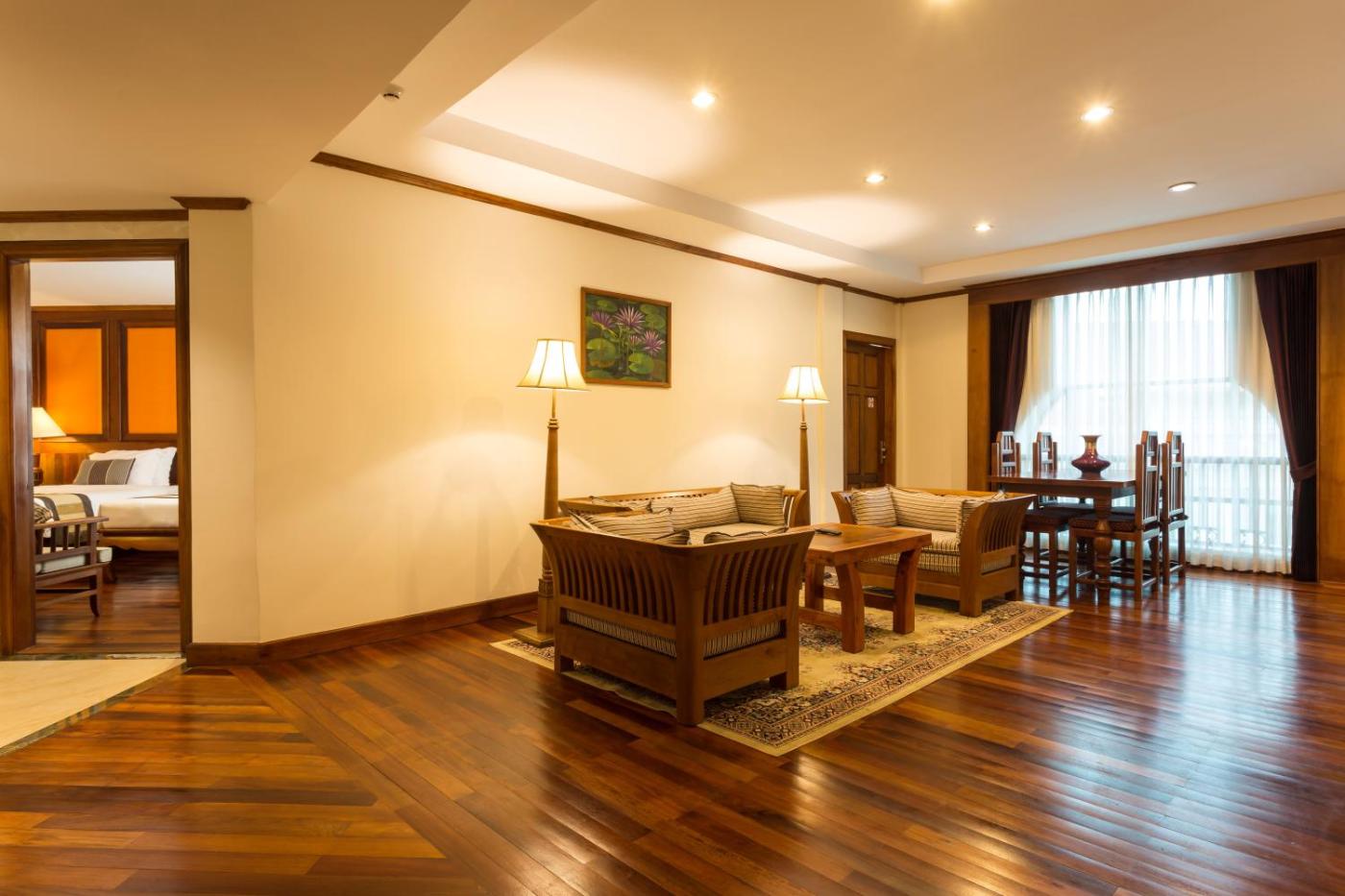 Standard Family Room. Located on the 1-2 floors, suite consists of interconnecting rooms featuring traditional Khmer décor with locally crafted wood furnishings. Benefits include : - Airport shuttle according to the hotels schedule (flight number & arrival time required) - Complimentary early check-in and late check-out (subject to room availability) - 20% off on food and beverages as well as spa services - 30% off on laundry service - Welcome drink and cold towel upon arrival - Free access to swimming pool, steam room and fitness centre - Free shuttle bus to downtown (subject to resorts schedule) - Daily turn down services ;